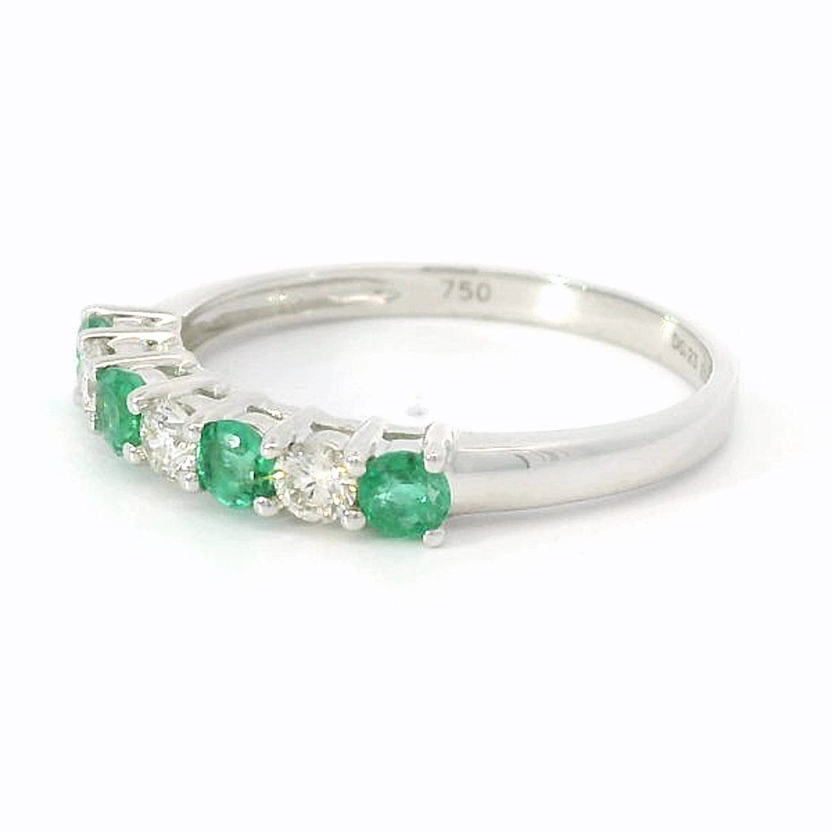 Deze verfijnde 18 karaat witgouden rijring combineert tijdloze elegantie met een subtiel kleuraccent. In een klassieke zetting zijn sprankelende diamanten afgewisseld met diep groene smaragden, wat zorgt voor een harmonieus spel van licht en kleur. Een ring die direct in het oog springt, maar nooit overheerst. Stijlvol, chic en vol karakter.